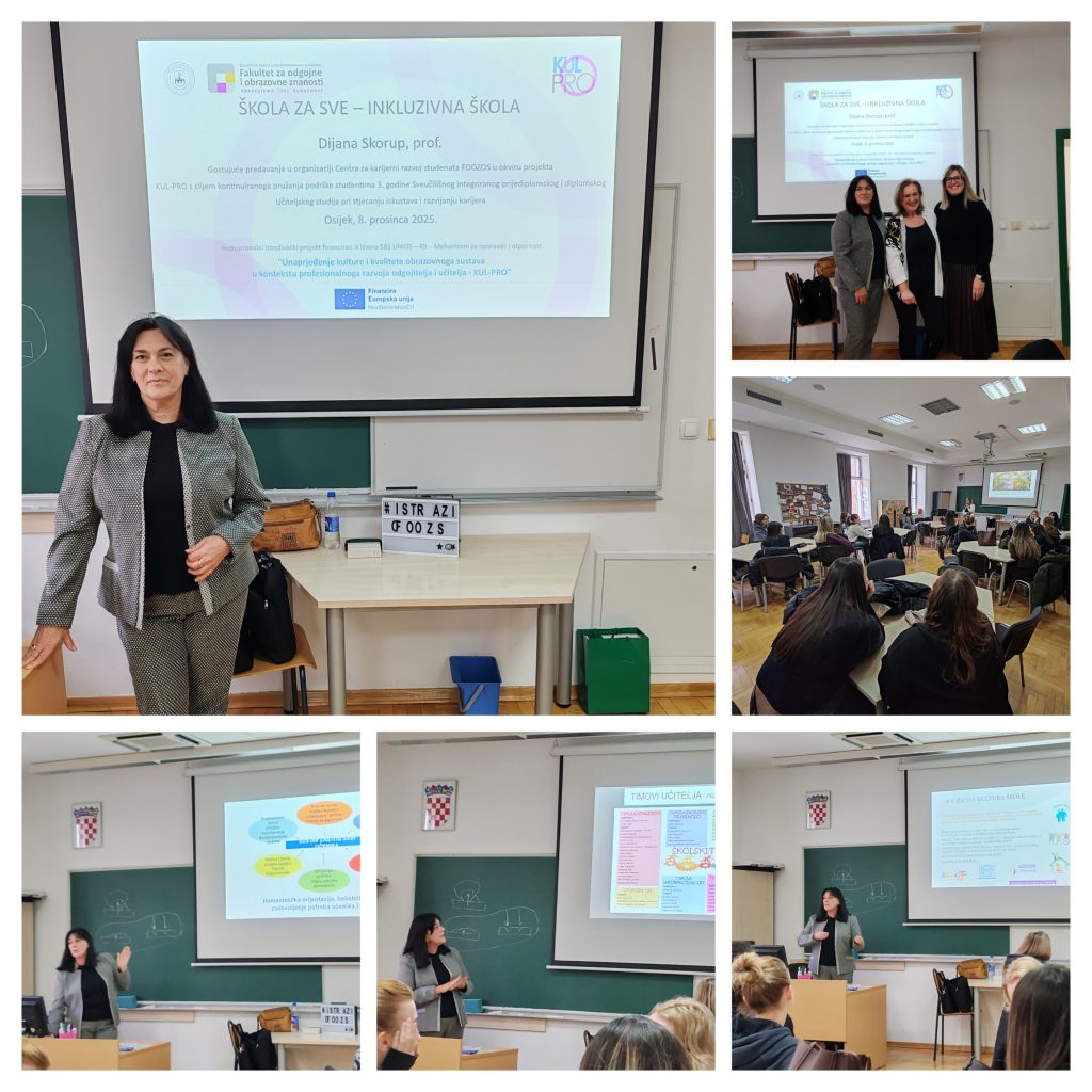 Dijana Skorup, prof., pedagoginja OŠ Ljudevita Gaja Osijek, održala je na FOOZOS-u 8. prosinca 2025. godine gostujuće interaktivno predavanje Škola za sve – inkluzivna škola studentima 3. godine sveučilišnoga integriranog prijediplomskog i diplomskog studija Učiteljski studij.