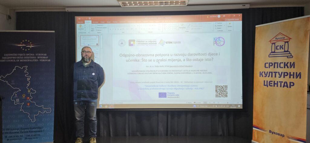 Dr. sc. Željko Rački, doc., ECHA Specialist in Gifted Education, uime Centra za istraživanje talenata i obrazovanje Fakulteta za odgojne i obrazovne znanosti u Osijeku održao je pozvano predavanje naslovljeno „Odgojno-obrazovna potpora u razvoju darovitosti djece i učenika: Što se u praksi mijenja, a što ostaje isto?” u okviru Međužupanijskoga stručnog skupa za odgojitelje i učitelje razredne nastave.