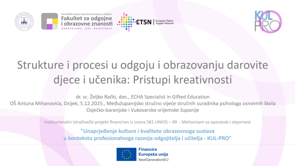 Dana 5. prosinca 2025. na Međužupanijskom stručnom vijeću stručnih suradnika psihologa Osječko-baranjske i Vukovarsko-srijemske županije, održanom u OŠ Antuna Mihanovića u Osijeku, dr. sc. Željko Rački, doc., ECHA Specialist in Gifted Education, predstojnik fakultetskoga Centra za istraživanje talenata i obrazovanje, održao je pozvano predavanje pod naslovom Strukture i procesi u odgoju i obrazovanju darovite djece i učenika: pristupi kreativnosti u okviru stručnoga usavršavanja osnovnoškolskih psihologa.