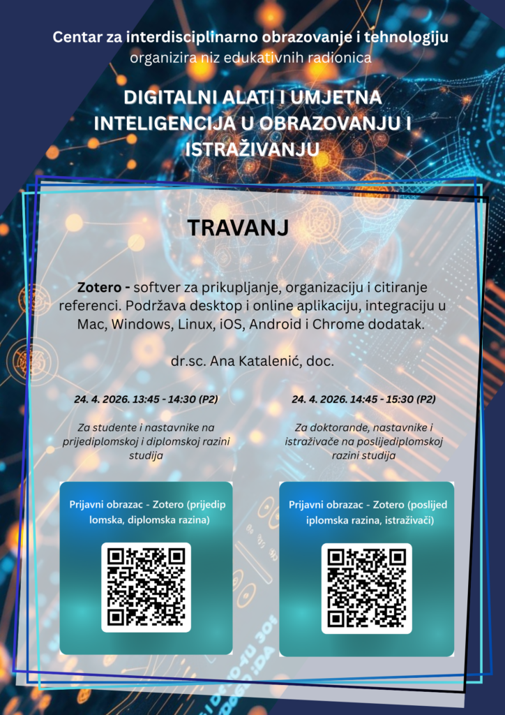 Dana 24. travnja 2026. održava se radionica o alatu Zotero pod vodstvom dr. sc. Ane Katalenić, doc., i to od 13.45 do 14.30 za studente i nastavnike, a od 14.45 do 15.30 za doktorande, nastavnike i istraživače. Radionice će se održati u predavaonici 2 (prizemlje nastavne zgrade FOOZOS-a).