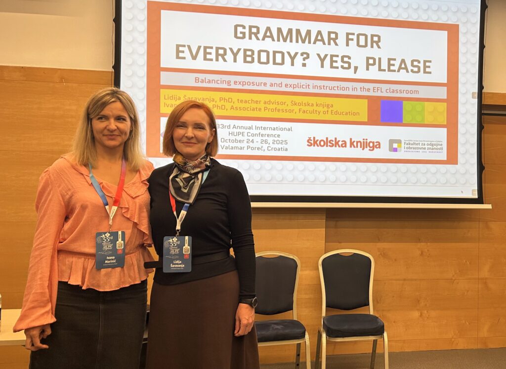 Na ovogodišnjoj konferenciji za profesore engleskoga jezika HUPE, koja je održana u Poreču od 24. do 26. listopada 2025., sudjelovala je i dr. sc. Ivana Marinić, izvanredna profesorica Fakulteta za odgojne i obrazovne znanosti, održavši u suradnji s nastavnicom engleskoga jezika dr. sc. Lidijom Šaravanjom radionicu Grammar for everybody? Yes, please.