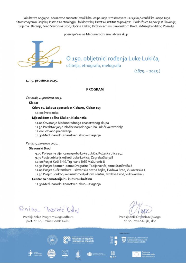 Fakultet za odgojne i obrazovne znanosti Sveučilišta Josipa Jurja Strossmayera u Osijeku, Sveučilište Josipa Jurja Strossmayera u Osijeku, Institut za etnologiju i folkloristiku, Hrvatski institut za povijest – Podružnica za povijest Slavonije, Srijema i Baranje, Grad Slavonski Brod, Općina Klakar, Državni arhiv u Slavonskom Brodu i Muzej Brodskog Posavlja, uz pokroviteljstvo Ministarstva kulture i medija Republike Hrvatske i Ministarstva znanosti, obrazovanja i mladih Republike Hrvatske, organiziraju Međunarodni znanstveni skup O 150. obljetnici rođenja Luke Lukića, učitelja, etnografa, melografa (1875. – 2025.).