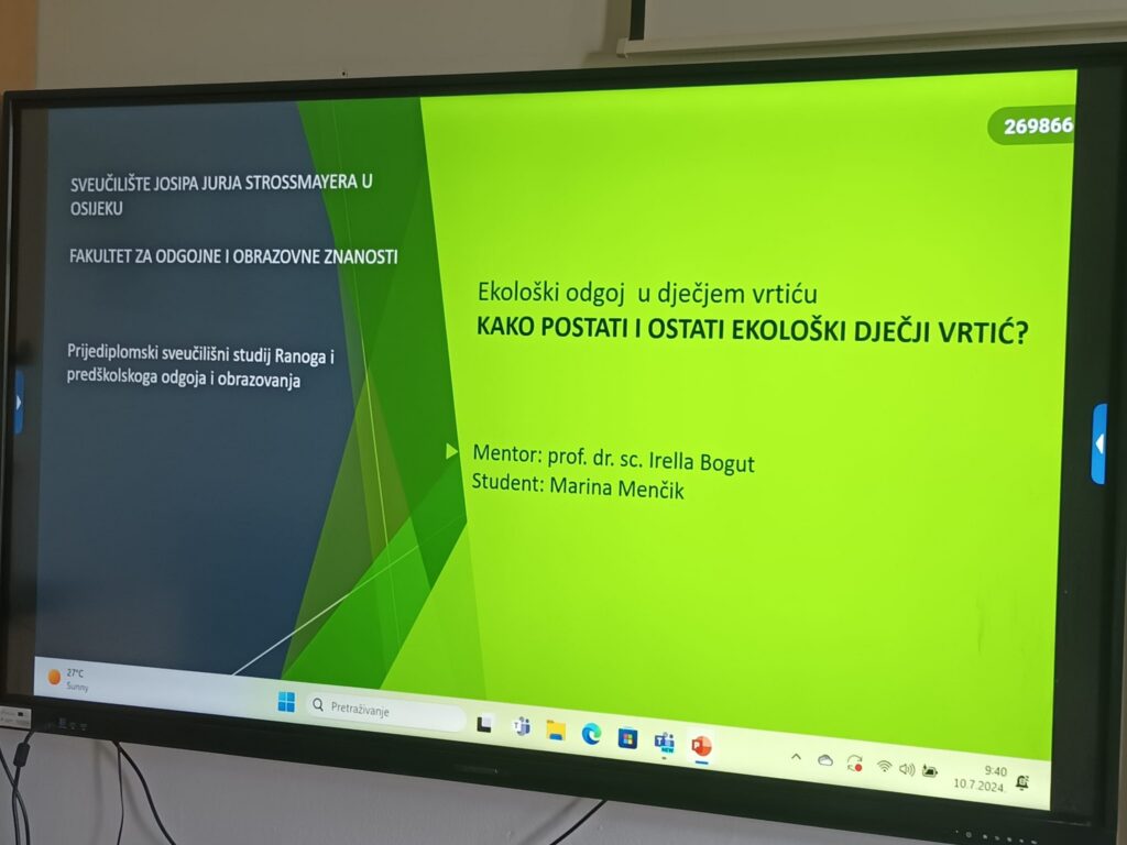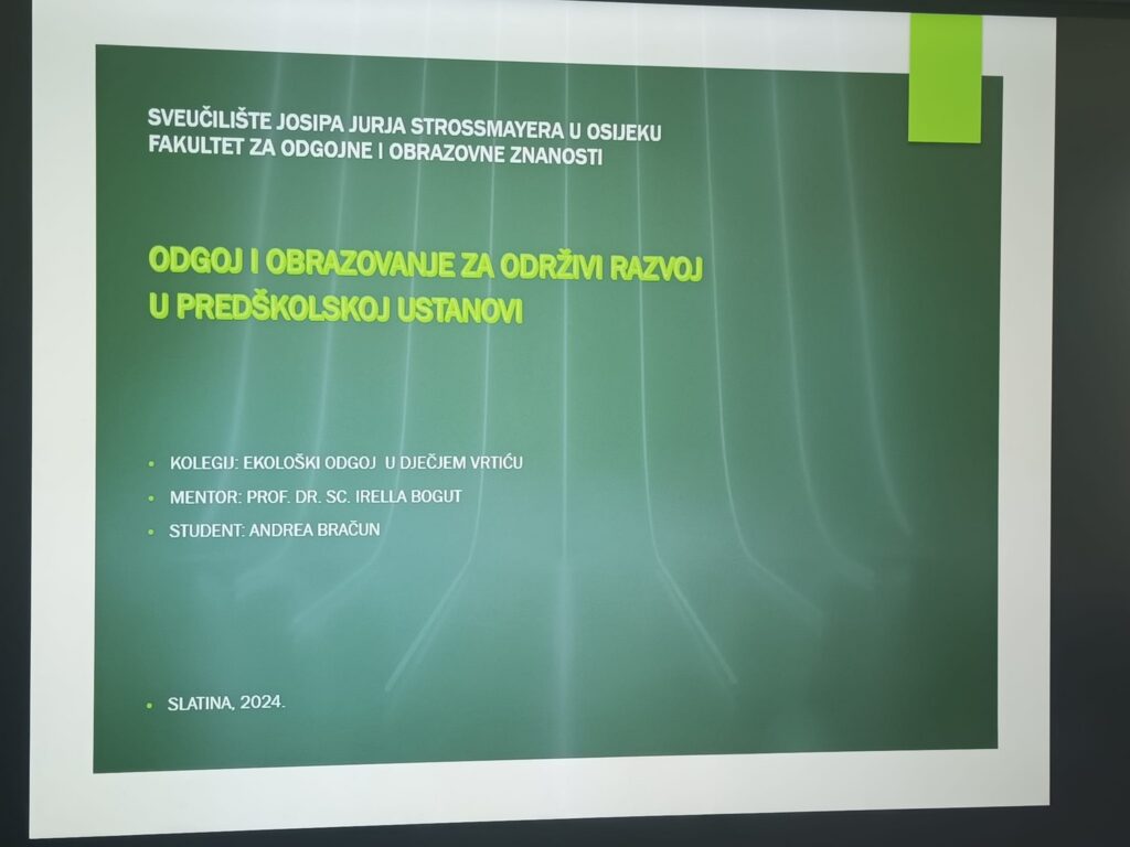 Danas su na dislociranom studiju Fakulteta za odgojne i obrazovne znanosti u Slatini Andrea Bračun i Marina Menčik uspješno obranile svoje završne radove pod mentorstvom prof. dr. sc. Irelle Bogut i postale prvostupnice ranoga i predškolskoga odgoja i obrazovanja. Istoga dana svoje završne radove obranile su i Laura Ćosić i Marija Stipeć pod mentorstvom dr. sc. Zvjezdane Penava Brekalo, doc. Ponosni smo na 1. generaciju studentica koje završavaju ovaj studijski program u Slatini i koje predškolske ustanove već očekuju jer odgojiteljica nedostaje na tržištu rada.