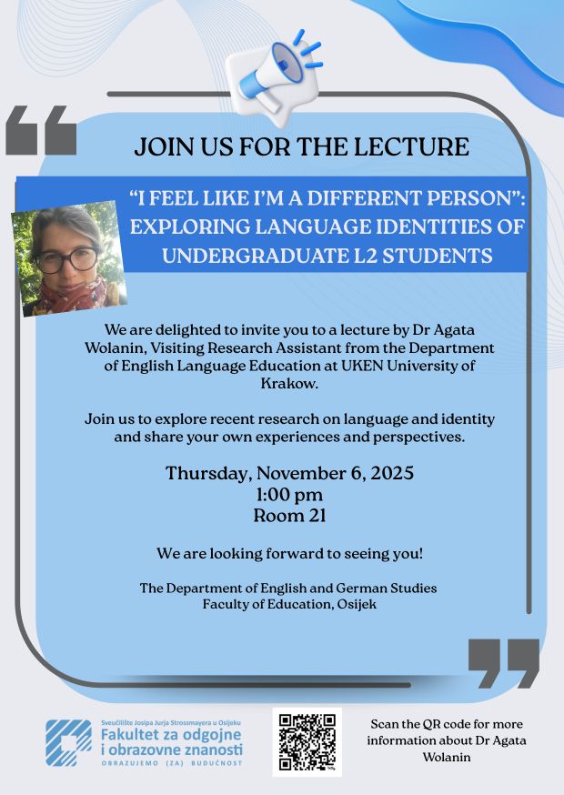 U četvrtak, 6. studenog 2025. u 13 sati gostujuća istraživačica dr. sc. Agata Wolanin (UKEN Sveučilište u Krakovu) održat će na FOOZOS-u predavanje naslovljeno “I feel like I’m a different person”: Exploring language identities of undergraduate L2 students.