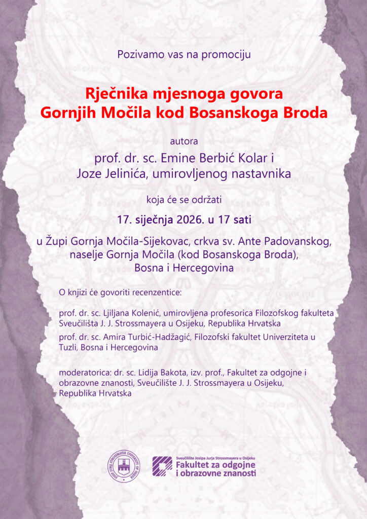 VIJESTIPredstavljanje „Rječnika mjesnoga govora Gornjih Močila kod Bosanskoga Broda” prof. dr. sc. Emine Berbić Kolar i Joze Jelinića, umirovljenoga nastavnika 05.01.2026.