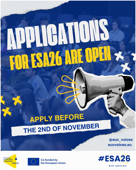 Alijansa COLOURS, europska mreža sveučilišta, kojoj pripada i Sveučilište Josipa Jurja Strossmayera u Osijeku, poziva studente sa svih svojih sveučilišta da se prijave za 5. izdanje European Student Assembly (ESA 2026) koje će se održati od 20. do 22. travnja 2026. u Europskom parlamentu u Strasbourgu.