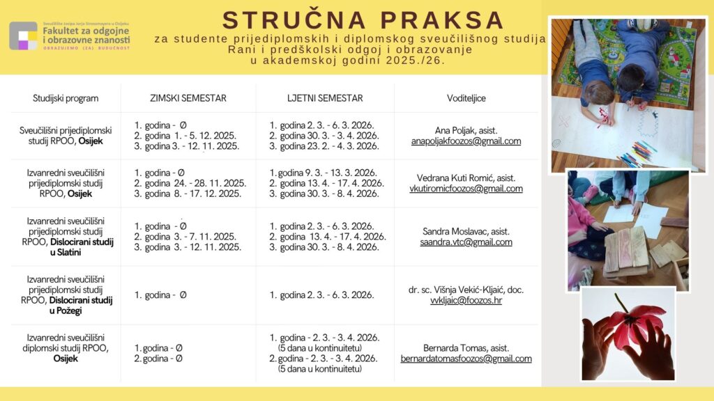 Stručna praksa za studente sveučilišnih prijediplomskih studija i diplomskog studija Rani i predškolski odgoj i obrazovanje na Fakultetu za odgojne i obrazovne znanosti u Osijeku u zimskom i ljetnom semestru akademske godine 2025./2026. održat će se prema navedenim terminima. Zahvaljujemo ravnateljima dječjih vrtića i odgojiteljima mentorima na suradnji i podršci u provedbi stručne prakse.