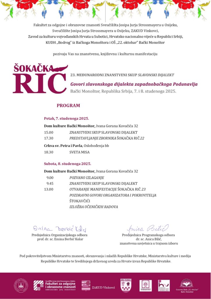 Fakultet za odgojne i obrazovne znanosti Sveučilišta Josipa Jurja Strossmayera u Osijeku, Sveučilište Josipa Jurja Strossmayera u Osijeku, ZAKUD Vukovarsko-srijemske županije, Zavod za kulturu vojvođanskih Hrvata, Hrvatsko nacionalno vijeće u Republici Srbiji, KUDH „Bodrog” i Osnovna škola „22. oktobar” Bački Monoštor, uz pokroviteljstvo Ministarstva kulture i medija Republike Hrvatske, Ministarstva znanosti, obrazovanja i mladih Republike Hrvatske i Središnjega državnog ureda za Hrvate izvan Republike Hrvatske, organiziraju znanstvenu, književnu i kulturnu manifestaciju ŠOKAČKA RIČ 23 u okviru koje će se održati i Znanstveni skup Slavonski dijalekt s međunarodnim sudjelovanjem.